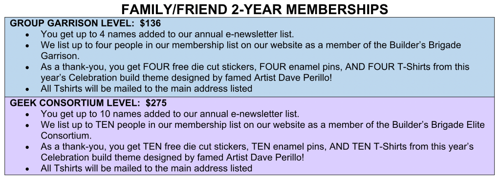 The Builder’s Brigade is our attempt to deliver to you one of kind unique memorabilia from our events. There are individual and group memberships for 2 years and various tiers.