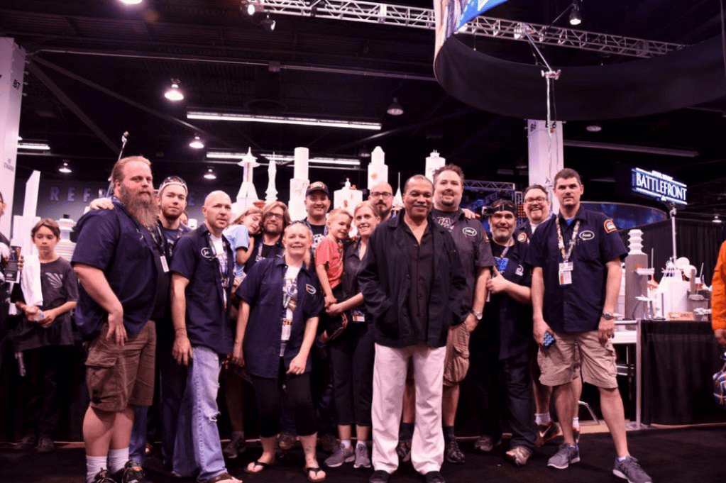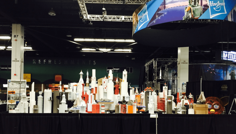 The convention moved to Anaheim and we officially partnered with Hasbro to build Cloud City, using foamcore, plates, and a variety of odds and ends. Billy Dee Williams even dropped in to check out his former home of Cloud City.