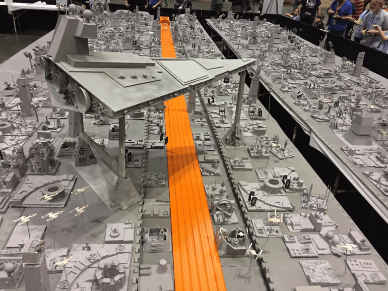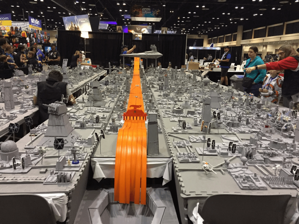 The convention returned to Orlando, and we officially partnered with Mattel/Hot Wheels to create the surface of the Death Star out of EVA foam tiles. It was the first build not centered around traditional 3.75″ action figures, and it added an interactive element of racing Hot Wheels down the 50-foot-long orange track in the trench—with the winner getting a special photo opportunity at the Mattel booth.