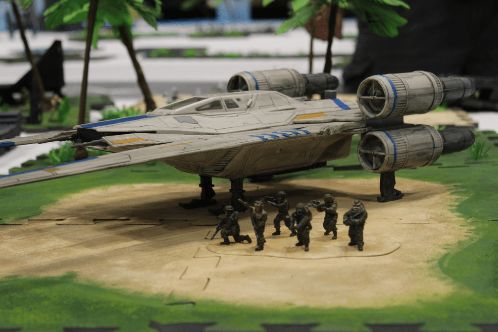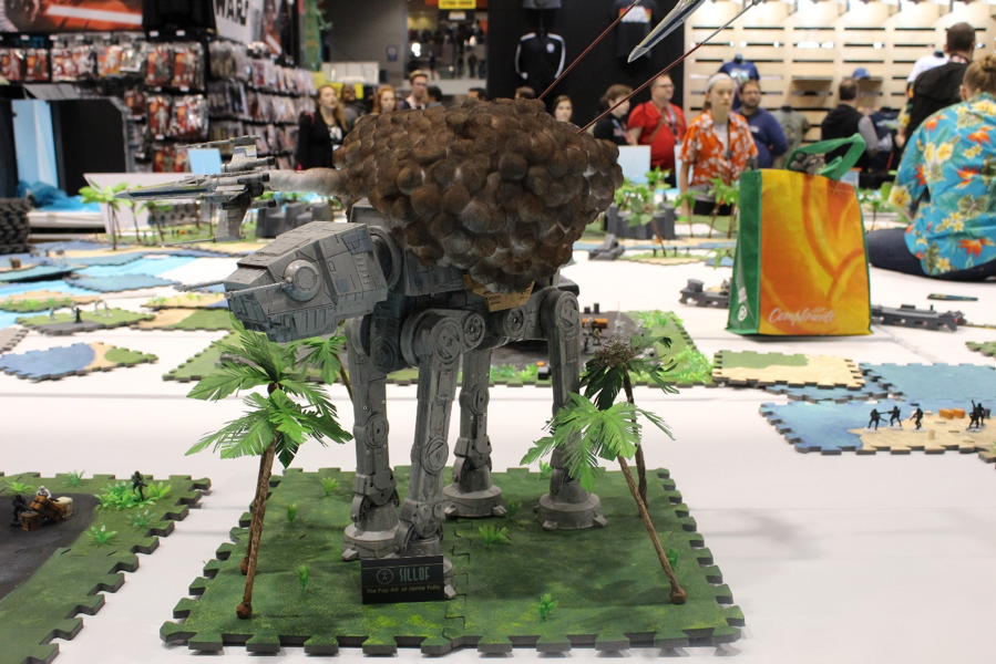 The convention moved to the Windy City. The theme of this build was the Battle of Scarif, from Rogue One. We changed scale again—this time to 1:48 scale—partnering with Fantasy Flight Games and using their game, Star Wars: Legion, as a basis. The build was our tallest to-date and featured a moving element with the orange shuttle, which ran back and forth across the scene. Forrest Whitaker and Rogue One writer and special effects legend, John Knoll, stopped by to give their approval.