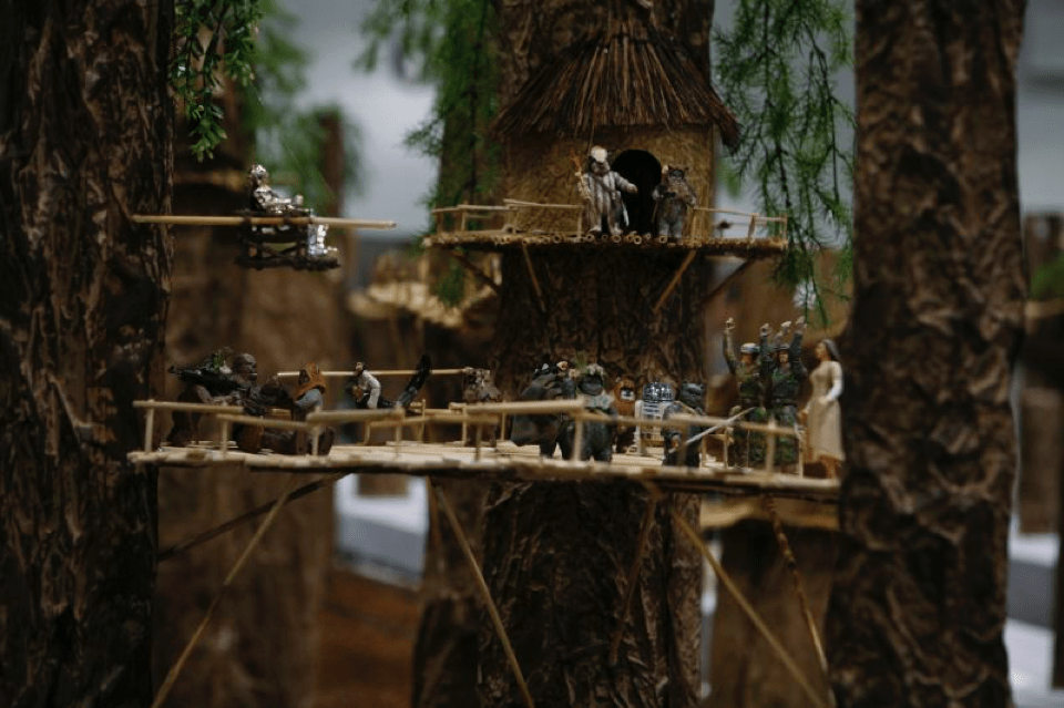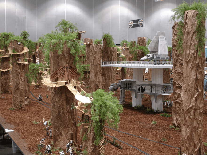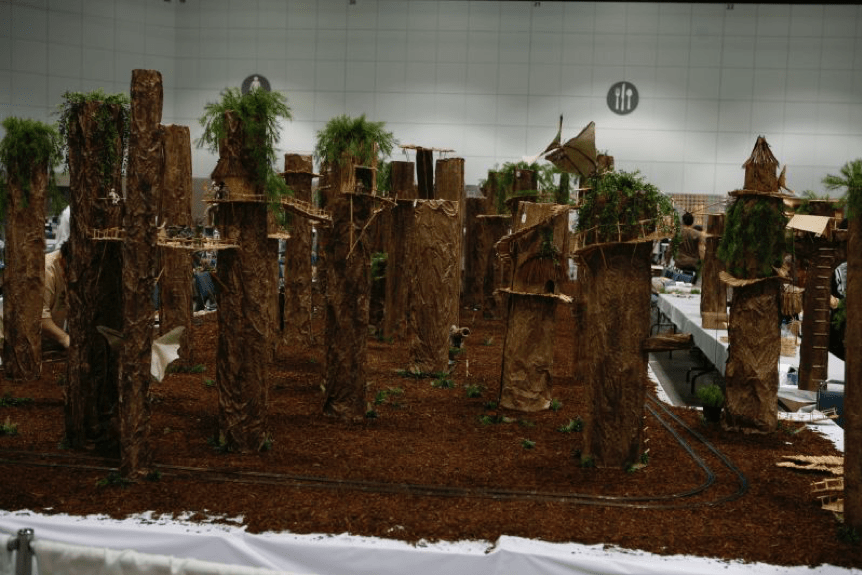 The Celebration moved to L.A. and we moved into the main hall, where fans created trees and huts from Endor. The build used mulch, packing tubes, wrinkled craft paper rolls, and fake plants to complete the look.
