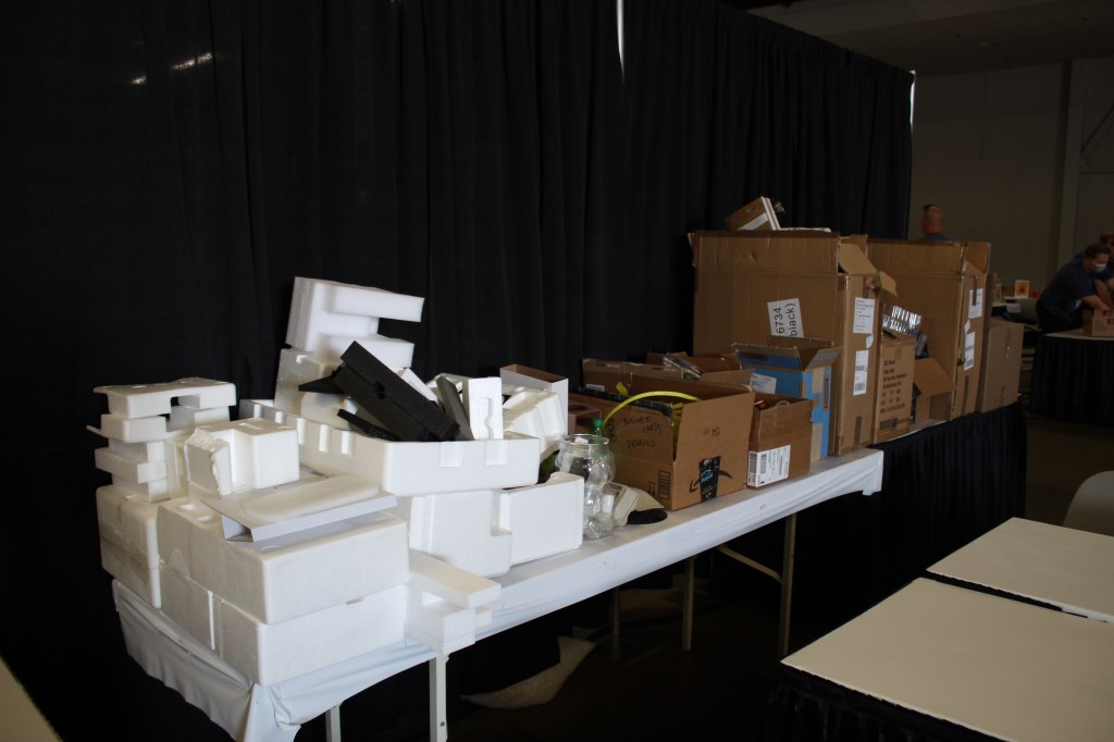 Most every part of the build used upcyled and discarded items like bottle caps, boxes we salvaged at the show, packing inserts and more.